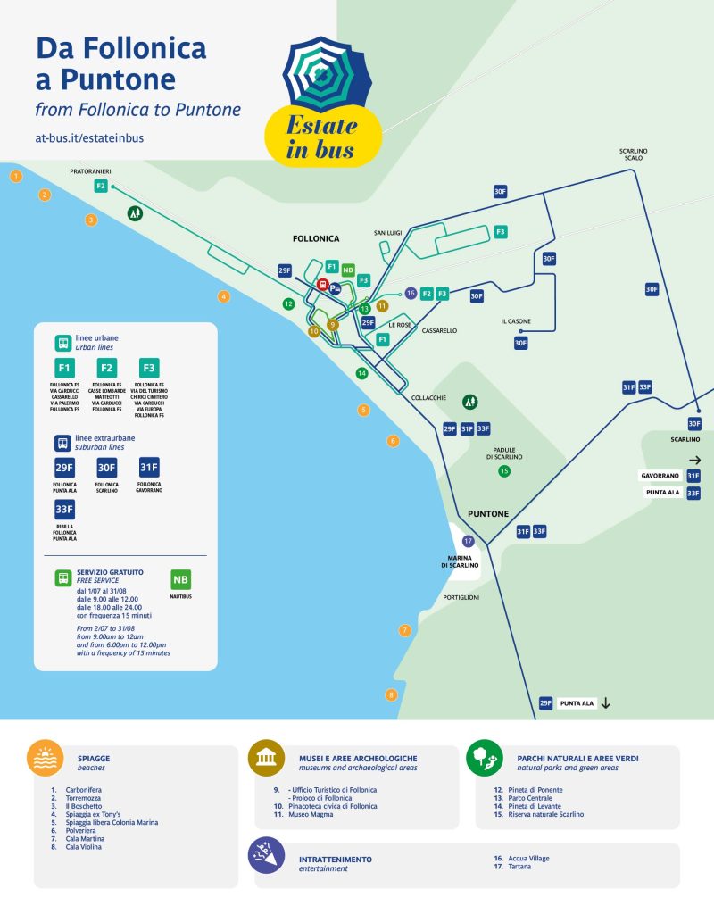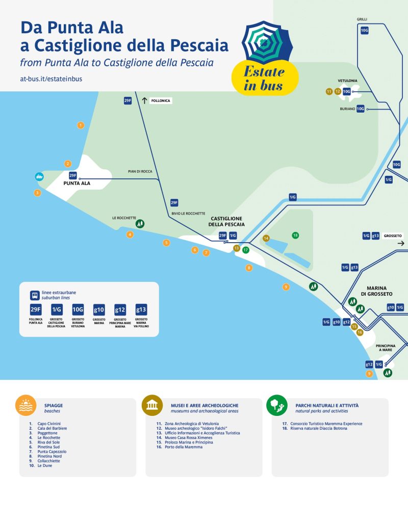 Una volta entrati nel sito di at-bus (www.at-bus.it) e aver aperto la pagina di Estateinbus (www.at-bus.it/it/estateinbus) si accede ad un ventaglio di possibilità. Tutti servizi bus di At sono spiegati in mappe speciali per tutta la costa toscana, dove, zona per zona, sono indicate spiagge, parchi, musei e siti utili raggiungibili con i mezzi di trasporto pubblico.