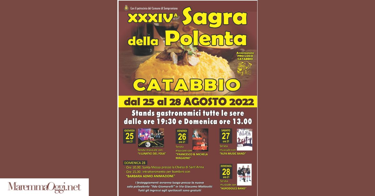 CATABBIO. Arriva la sagra della polenta nel borgo. Organizzata dalla Pro loco Catabbio, dopo due anni di stop, nei giorni 25,26,27 e 28 Agosto 2022 torna la Sagra della polenta. Dagli stand gastronomici uscirà tutta la bontà che i territorio può offrire, oltre al piatto principe, anche gustose ricette tipiche maremmane.