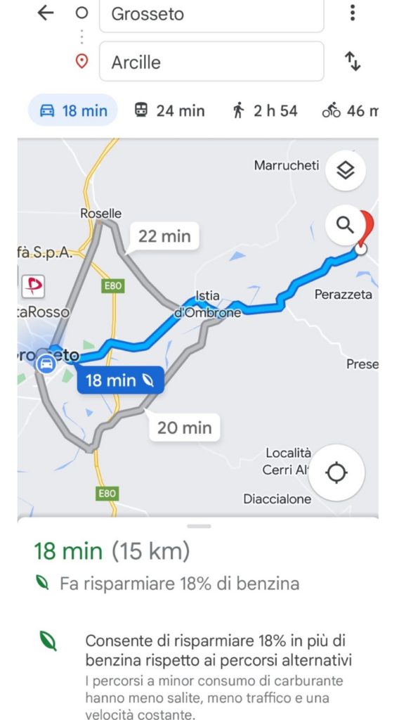 - il percorso ecologico/economico: nella pianificazione (percorso, giorno e ora) di un itinerario sullo smartphone, l’app Maps mostra il percorso più ecologico ed economico, che indica con un’apposita icona: una fogliolina verde.