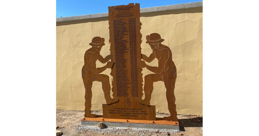 Tale stele ricorda i i morti in miniera dal 1892 al 1984, realizzata in acciaio corten, materiale che ricorda il passare del tempo e le formazioni ferrose del territorio.