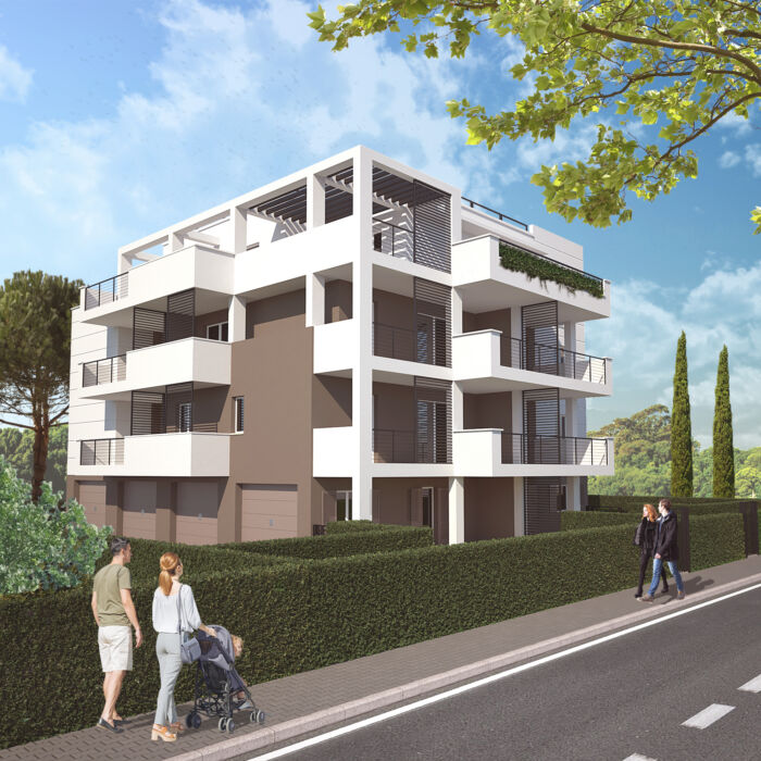 Una piccola palazzina di soli sette appartamenti dal design moderno, caratterizzato da elementi architettonici lineari, interni raffinati e arricchiti da materiali pregiati, grandi terrazze e/o giardini privati, ampie vetrate che affacciano sul verde circostante e sul panorama della campagna collinare maremmana.