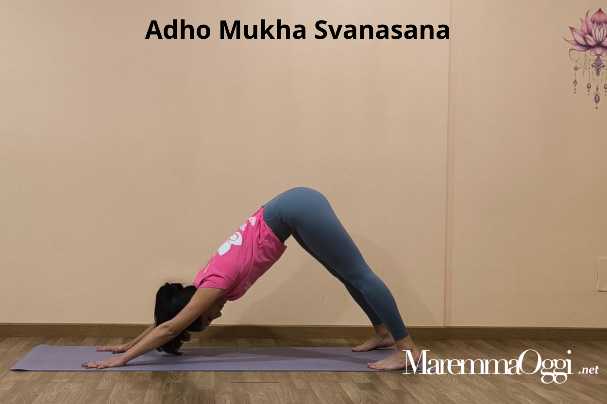 Adho Mukha Svanasana: braccia e gambe attive e distese, bacino verso l’alto. Dalla spinta delle mani e dall’estensione delle braccia con il contributo del lavoro dei femori che spingono indietro, portare il peso del corpo verso l’alto e indietro verso le gambe.