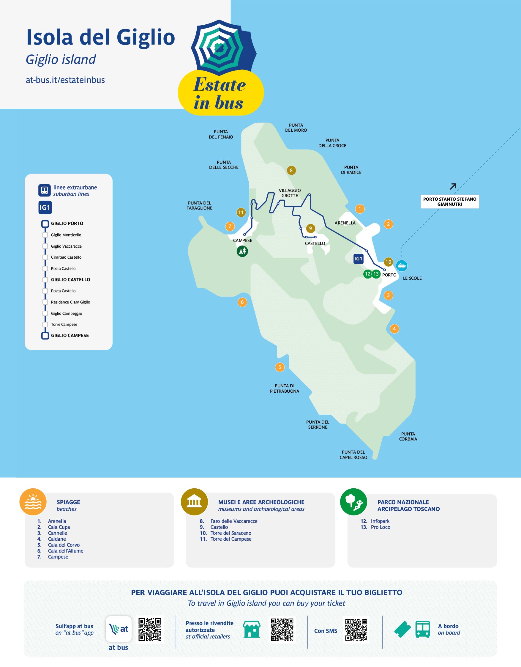 Una volta entrati nel sito di at-bus (www.at-bus.it) e aver aperto la pagina di Estateinbus (www.at-bus.it/it/estateinbus) si accede ad un ventaglio di possibilità. Tutti servizi bus di At sono spiegati in mappe speciali per tutta la costa toscana, dove, zona per zona, sono indicate spiagge, parchi, musei e siti utili raggiungibili con i mezzi di trasporto pubblico.
