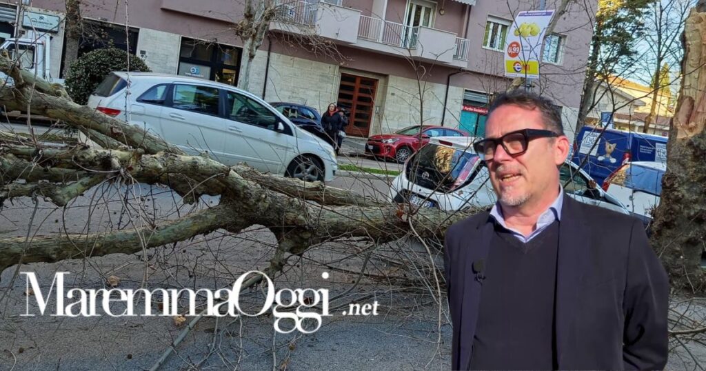 GROSSETO. Complice il forte vento, ieri pomeriggio, martedì 14 gennaio, un grosso albero si è spezzato ed è crollato a terra in via Emilia tra il marciapiede e la strada, proprio di fronte all’uscita della scuola elementare Gabelli.