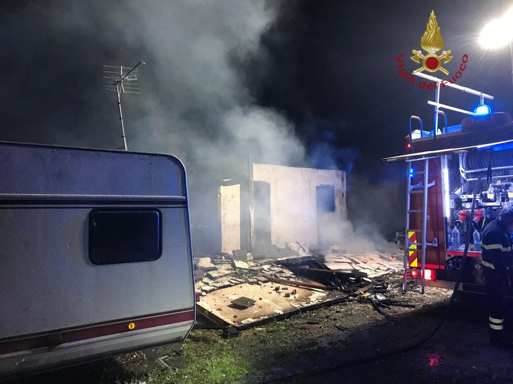 Completamente distrutta la struttura ma grazie all’intervento dei vigili del fuoco, l’incendio non ha interessato una roulotte parcheggiata nelle immediate vicinanze.