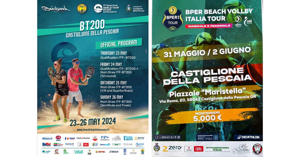 «Vorremmo ringraziare – affermano Luca Bidolli dell’associazione Beach Tennis Toscana Event e Walter Finocchi della Beach Volley Maremma – tutti gli sponsor che hanno aderito e supportato l’organizzazione di questi due importanti eventi che porteranno un grande spettacolo sportivo di beach tennis e beach volley a Castiglione della Pescaia».