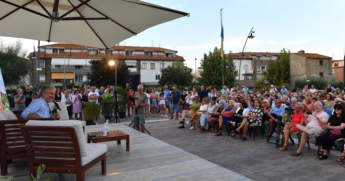 Anche Beppe Fiorello si è presentato con qualche minuto di ritardo, e Veronesi ha continuato la gag del giorno prima con la sindaca Elena Nappi, che si è prestata volentieri al gioco prima che lo stesso Beppe Fiorello fosse presentato dalla Nappi stessa. L’attore e ora anche regista, è arrivato vestito casual, jeans e camicia aperta celeste con una maglia bianca sotto, e mocassini blu. E fin da subito l’empatia con il caloroso pubblico castiglionese non è mancato.