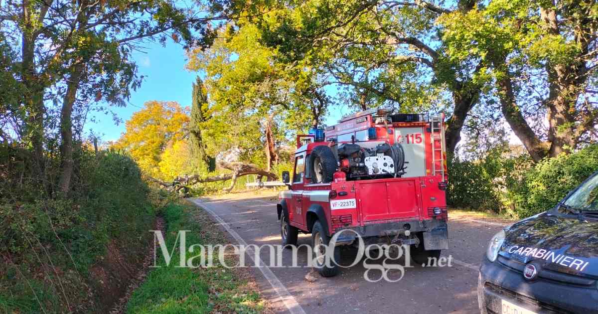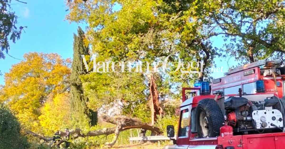 Sul posto i carabinieri della stazione di Civitella Paganico e i vigili del fuoco che hanno tagliato la pianta in pezzi, in modo da poter liberare la provinciale.