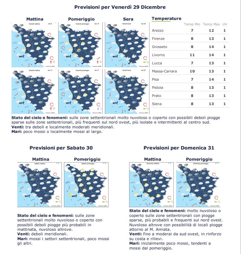 «Nelle prossime ore saremo più precisi – conferma Gozzini – ma per l’alta Toscana sono previste piogge, che potrebbero arrivare anche in Maremma, proprio per la serata dell’ultimo dell’anno. La temperatura sarà comunque mite».