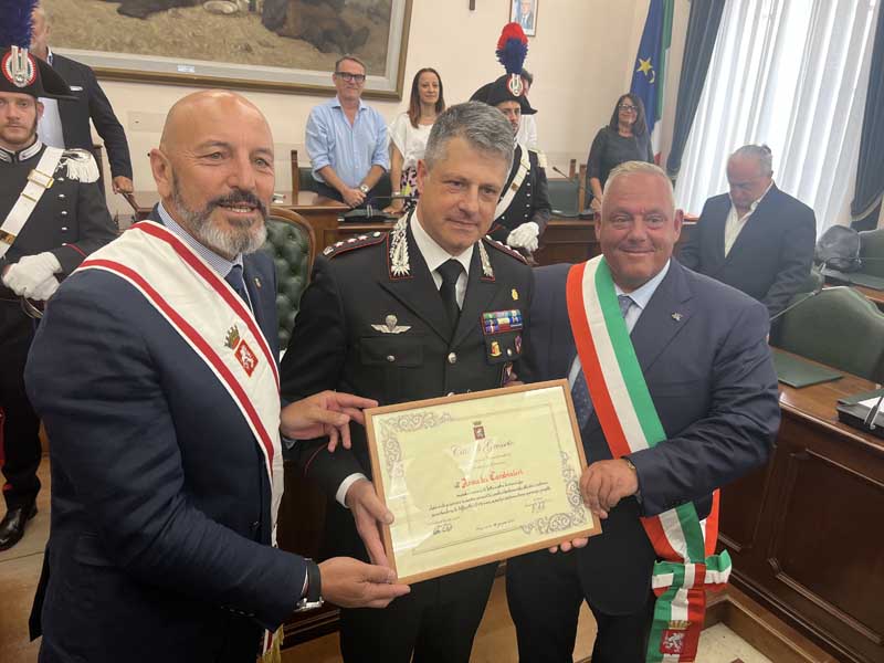 Questa la motivazione: «L’Amministrazione comunale conferisce la cittadinanza onoraria all’Arma dei carabinieri membri essenziali della nostra democrazia, chiamati a servire la nostra comunità condividendone vita, attività e cultura, avvertendone le difficoltà ed i timori nonché sostenendone speranze e progetti».