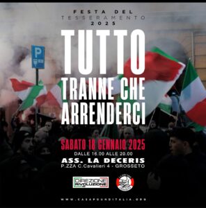 GROSSETO. CasaPound Italia annuncia l’avvio della campagna di tesseramento per l’anno 2025, intitolata “Tutto tranne che arrenderci!”, un messaggio chiaro di impegno e determinazione di fronte alle sfide che il movimento si appresta ad affrontare per risollevare i destini dell’Europa.