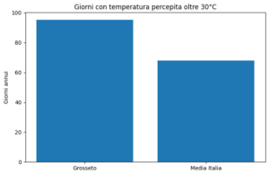 In questo parametro la provincia maremmana si colloca al 100° posto, con circa 95 giorni all’anno con caldo percepito elevato.