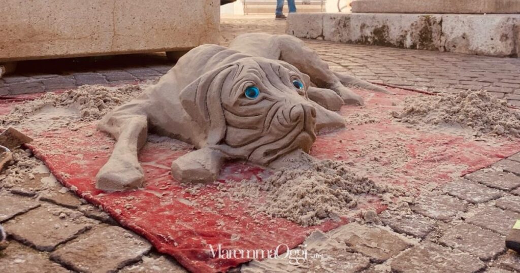 GROSSETO. Questa mattina, venerdì 22 marzo, chi cammina per il corso rimarrà piacevolmente sorpreso nel trovare un cane di sabbia accoccolato di fronte alla statua di Ettore Socci.