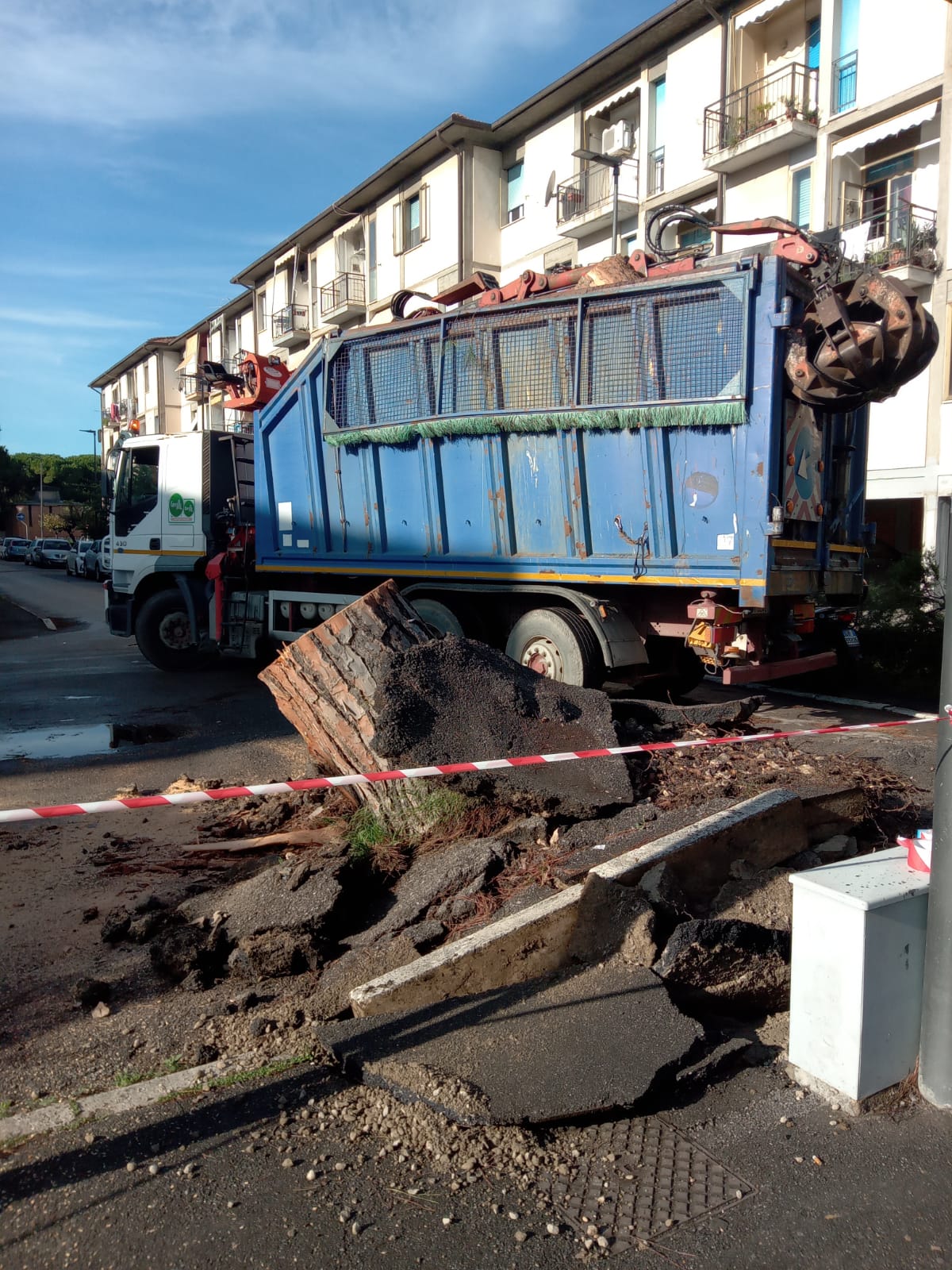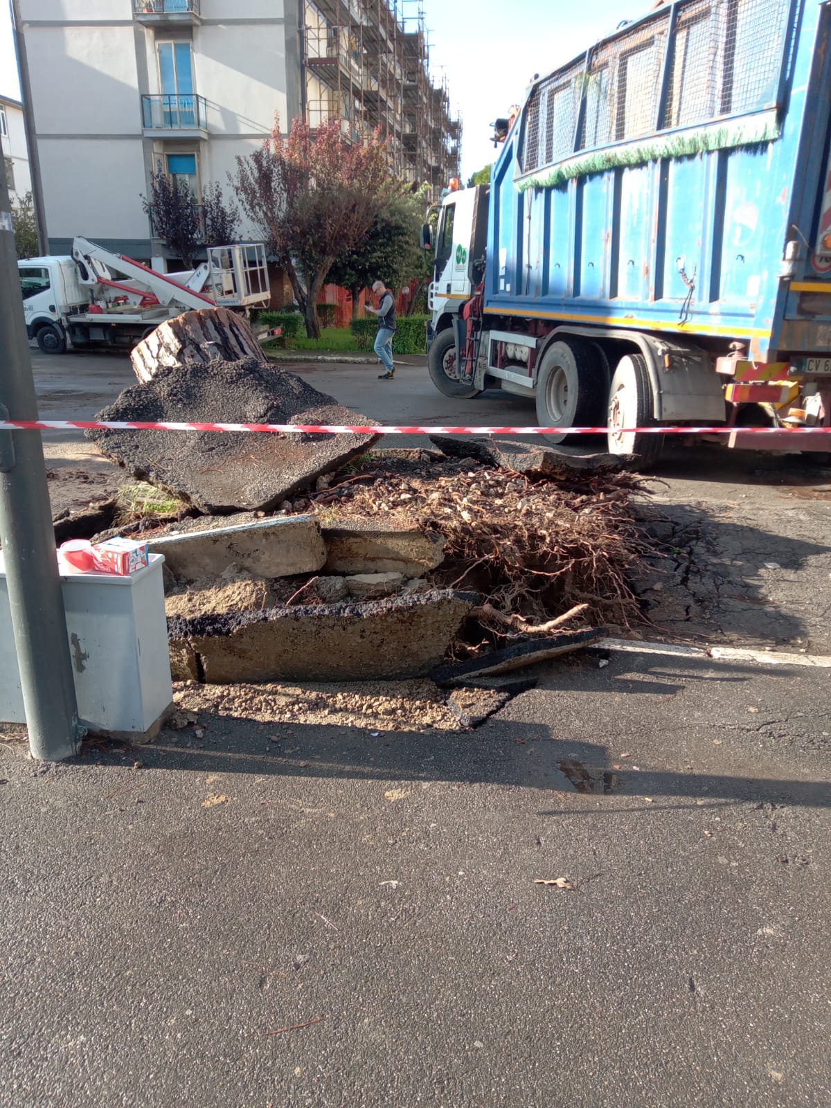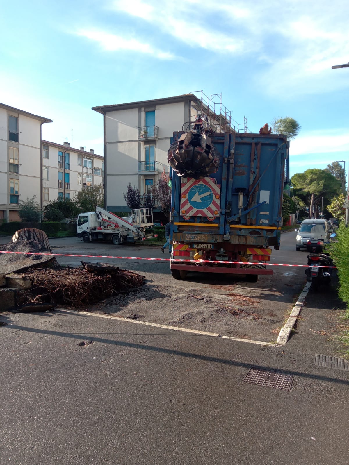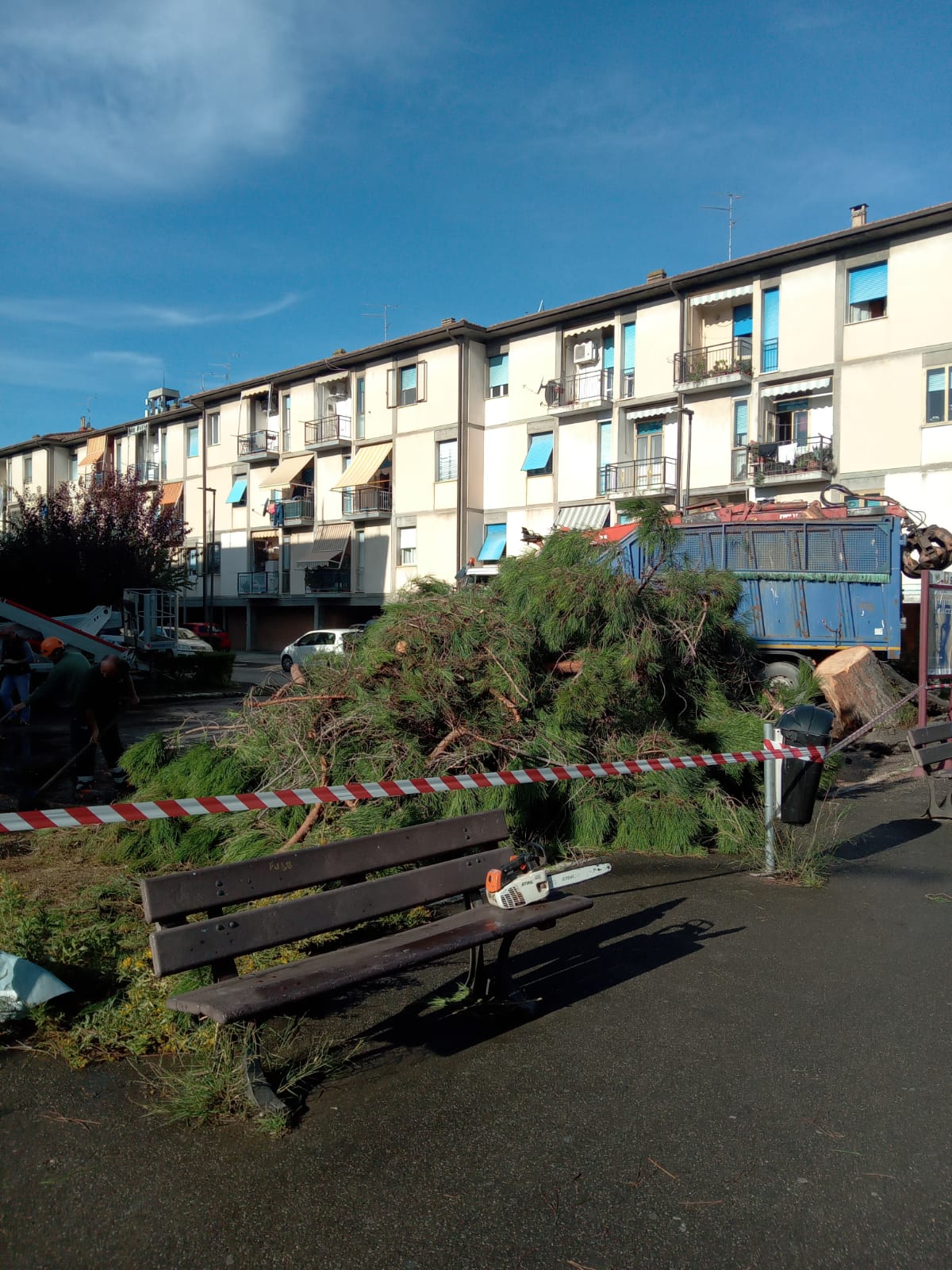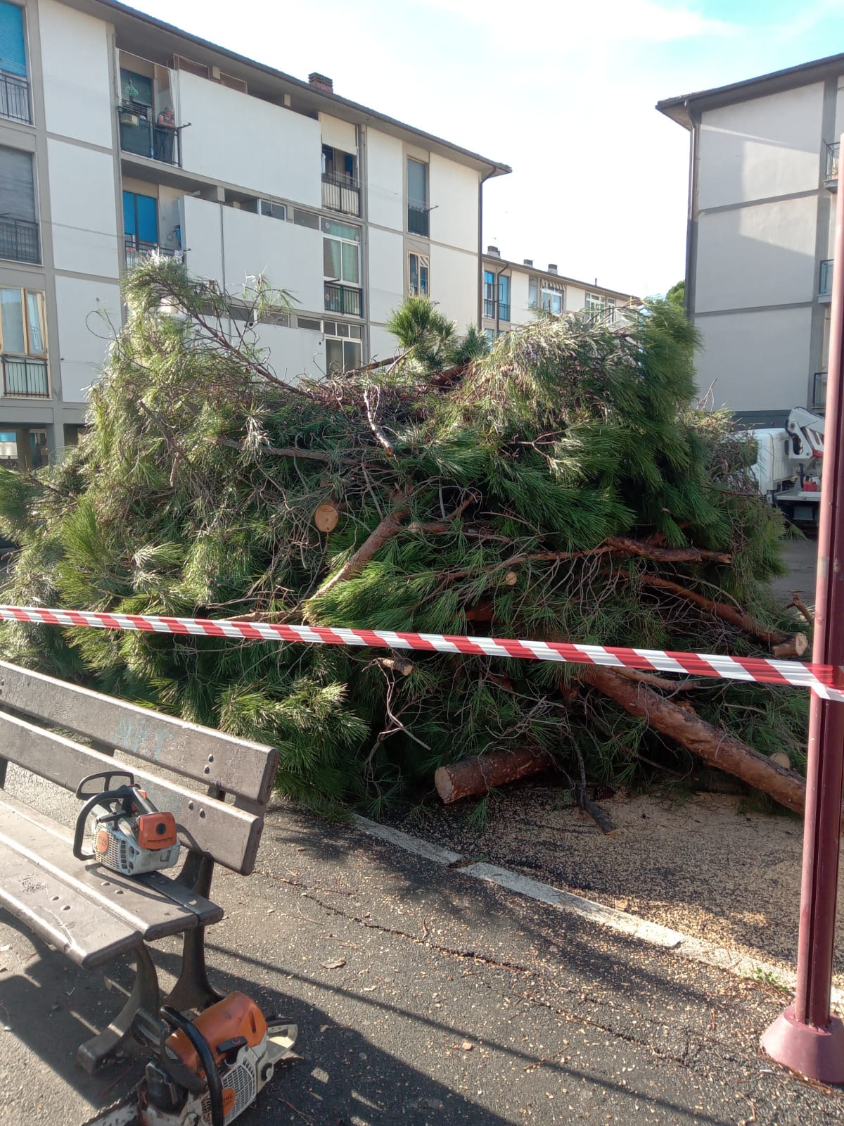 La presenza del grosso pino pericolante era stata segnalata dai cittadini al Comune. Il maltempo dei giorni scorsi, ha fatto il resto. Durante la notte tra sabato 19 e domenica 20 ottobre il grosso albero è caduto danneggiando diverse auto in sosta.