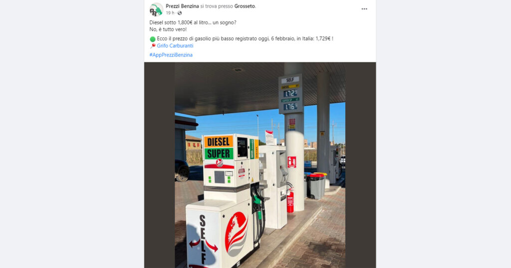 Scrivendo: “Diesel sotto 1,800€ al litro… un sogno? No, è tutto vero! Ecco il prezzo di gasolio più basso registrato oggi, 6 febbraio, in Italia: 1,729€ ! Grifo Carburanti”.