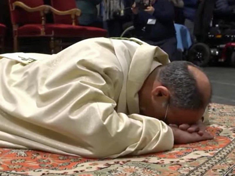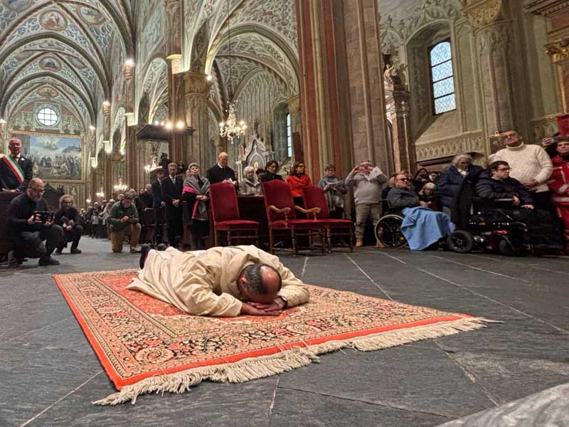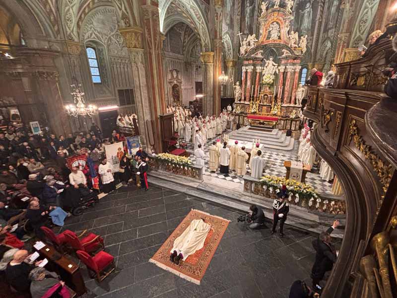 Poi don Bernardino ha assunto gli impegni che per antica traduzione sono richiesti ai candidati al l’episcopato. Si è quindi prostrato a terra durante il canto delle litanie dei santi.