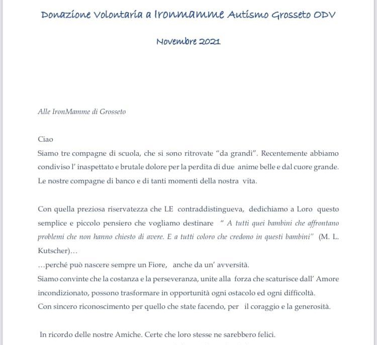 GROSSETO. «Ciao, siamo tre compagne di classe che si sono ritrovate da grandi». Comincia con queste parole la lettera che tre grossetane hanno inviato alle Iron mamme, la onlus formata da un gruppo di genitori della provincia di Grosseto con figli autistici: una lettera che accompagna un gesto bellissimo, una donazione fatta all’associazione delle mamme di ferro.