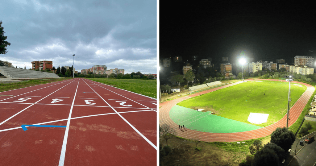 La riqualificazione ha interessato l’intero complesso sportivo. Si va dal rifacimento del manto della pista e delle tribune alla ristrutturazione completa degli spogliatoi, fino alla realizzazione del nuovo impianto di illuminazione con torri faro e all’ammodernamento degli impianti elettrico, idrosanitario e fognario. Sono stati inoltre installati un nuovo impianto di riscaldamento e un sistema fotovoltaico, in un’ottica di maggiore efficienza e sostenibilità. Il manto sintetico della pista, realizzato dall’azienda Mondo – scelta anche per le Olimpiadi di Parigi 2024 – garantisce standard tecnici di altissimo livello.