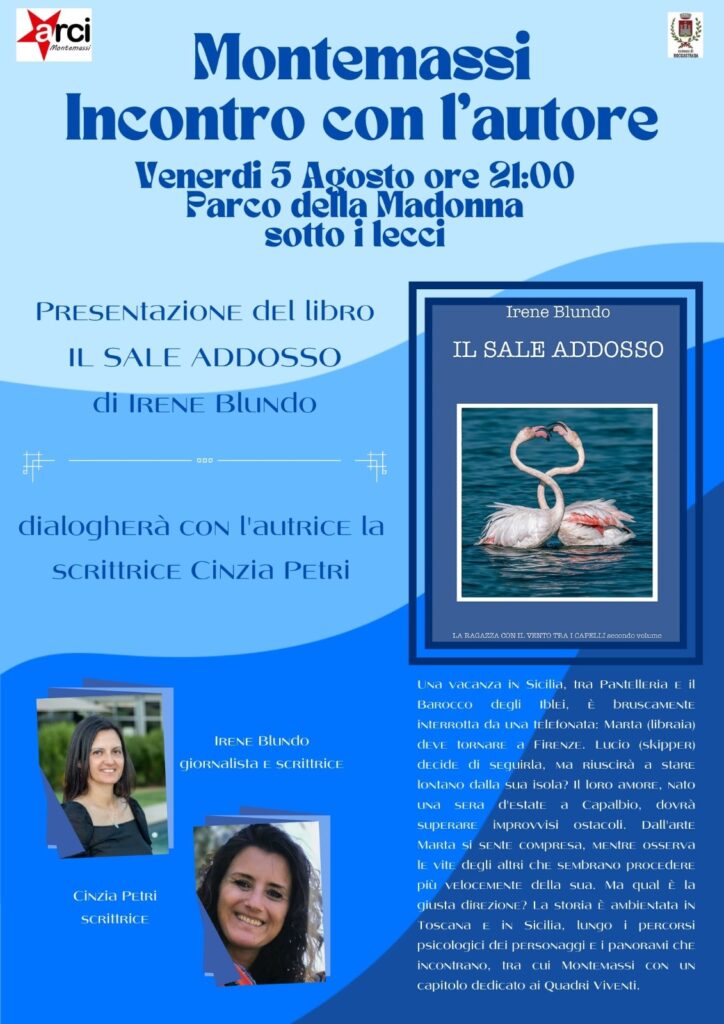 MONTEMASSI. Venerdì 5 agosto alle ore 21 al Parco della Madonna sotto i lecci a Montemassi verrà presentato “Il sale addosso”, il nuovo romanzo di Irene Blundo. Con l’autrice dialogherà la scrittrice Cinzia Petri. La presentazione è organizzata in collaborazione con l’Arci di Montemassi e con il patrocinio del Comune di Roccastrada.