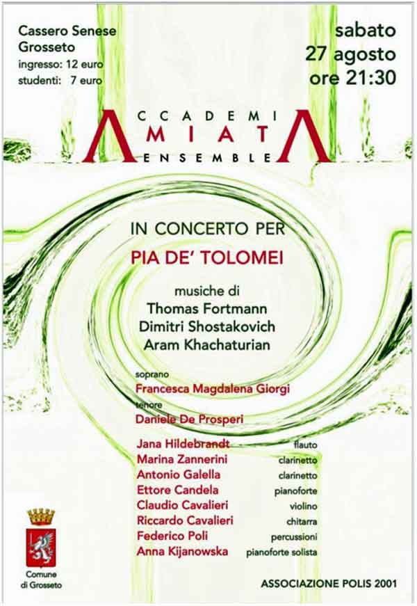 GROSSETO. Sabato 27 agosto alle 21,30, al Cassero, ecco l’Accademia Amiata Ensemble “In concerto per Pia de’ Tolomei”.