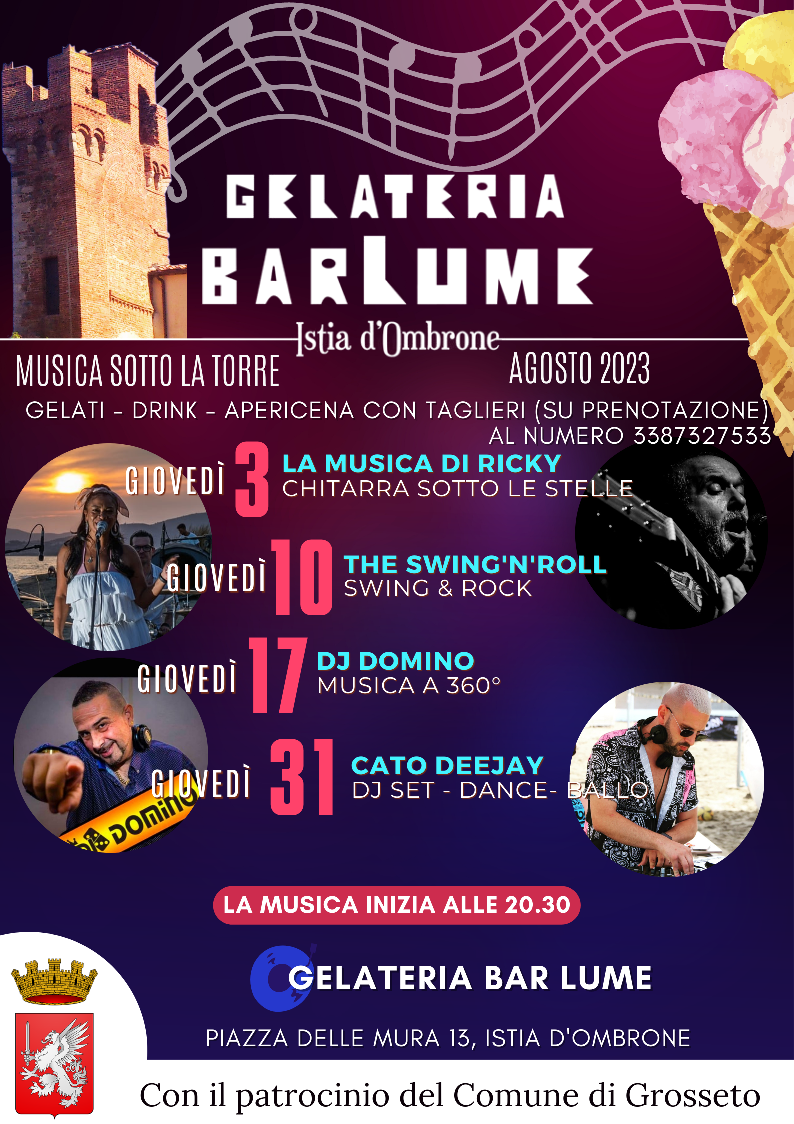 ISTIA D’OMBRONE. Nella frazione di Grosseto prosegue la rassegna “Musica sotto la torre”. Dalle 20.30 in piazza delle Mura, ogni giovedì di agosto la gelateria Bar Lume si accenderà con la musica.