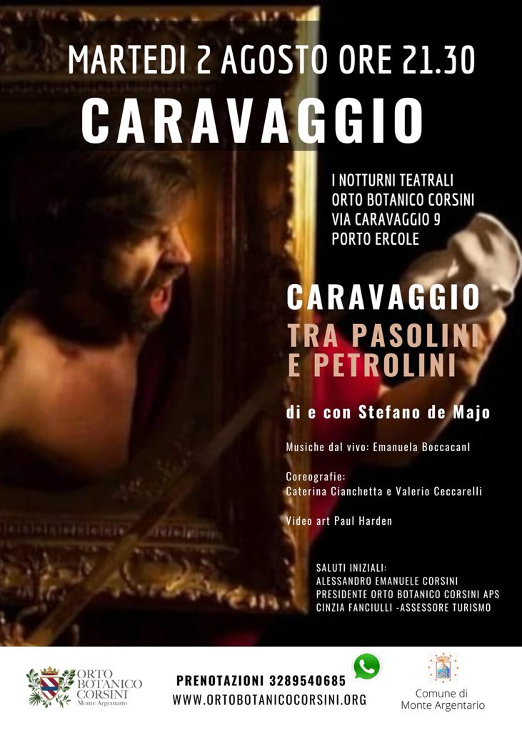 PORTO ERCOLE. Nell’ambito della rassegna “I notturni teatrali” che si sta svolgendo all’orto botanico Corsini è in programma martedì 2 agosto alle ore 21.30 una serata dedicata a Caravaggio. L’evento, ideato e condotto da Stefano de Majo, è un percorso di arte, teatro, letteratura tra Caravaggio, Pasolini e Petrolino: vite al limite, tra luci ed ombre, tra vortici oscuri e ascese straordinarie, personalità anticonformista che hanno lottato contro pregiudizi ed emarginazione.