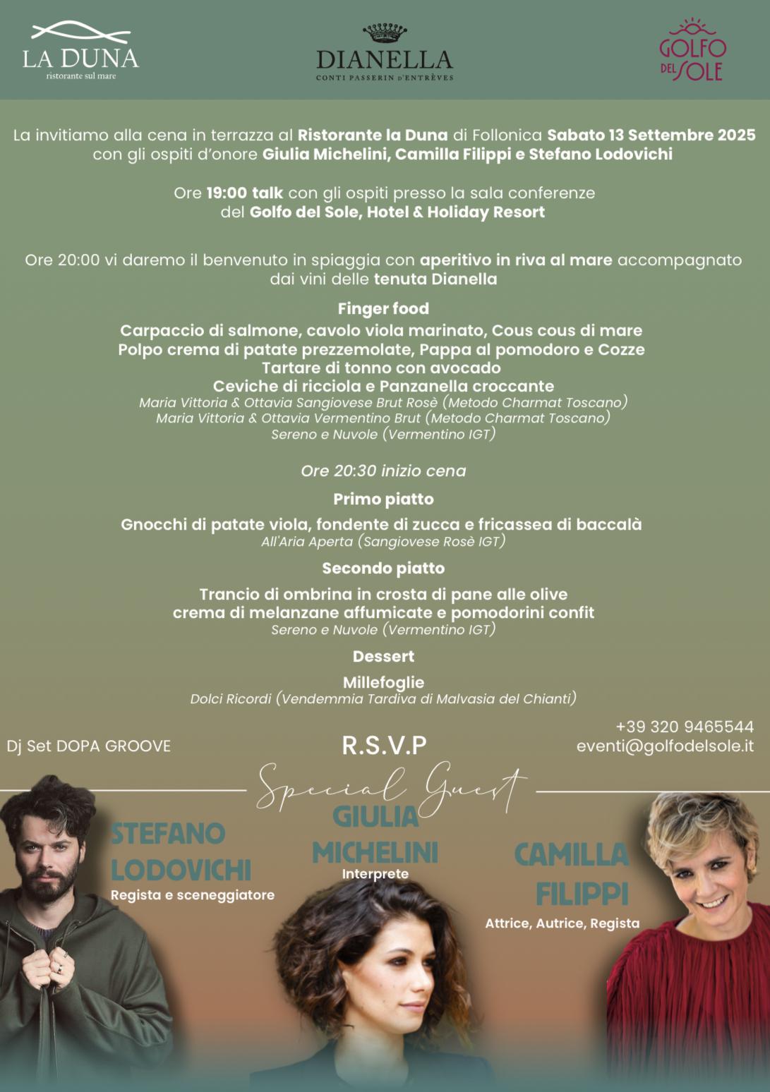 Dopo l’incontro seguirà la cena sul mare sulla terrazza del ristorante La Duna, con un menu d’autore firmato dalle eccellenze del territorio. Dall’aperitivo di benvenuto con i vini della Tenuta Dianella a finger food raffinati come ceviche di ricciola e tartare di tonno, fino agli gnocchi di patate viola con baccalà, al trancio di ombrina in crosta e al dessert millefoglie, la serata promette un viaggio tra sapori autentici e creatività.