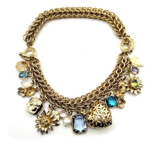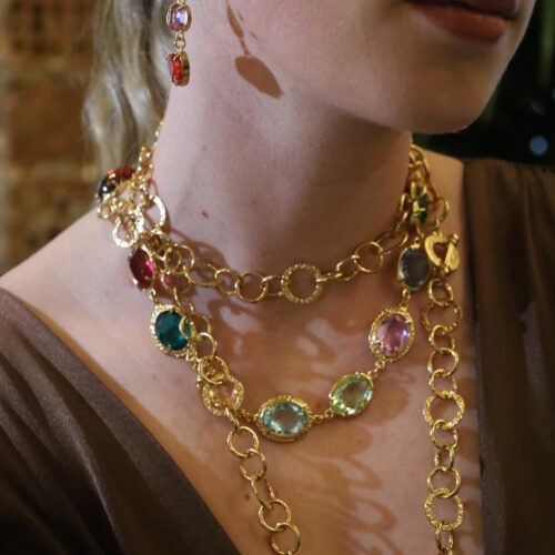 Le creazioni nascono dall’applicazione su bronzo placcato oro di frammenti di porcellane antiche, anche del secolo scorso, impreziositi da cristalli, zirconi e vetri molati: ogni pezzo è lavorato singolarmente e diventa un piccolo oggetto d’arte da indossare.