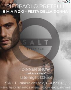 GROSSETO. È inarrestabile la scia di personaggi in trend che il Salt Tapas Bar porta in città. Dopo una serie di ospiti di richiamo, questa volta in piazza del Sale arriva un volto amatissimo dello spettacolo italiano: sabato 8 marzo, per la Festa della donna, a festeggiare il pubblico sarà il carismatico e raffinato Pierpaolo Petrelli, showman, ballerino e personaggio televisivo seguitissimo anche sui social.