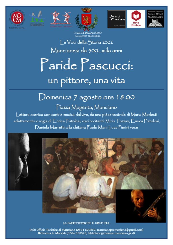 MANCIANO. Arrivata alla sua quarta edizione, la rassegna “Le Voci della Storia”, ideata e diretta dal direttore dei Musei Civici di Manciano e Saturnia Massimo Cardosa, presenta una lettura scenica con musica dal vivo dal titolo “Paride Pascucci: un pittore, una vita”.
