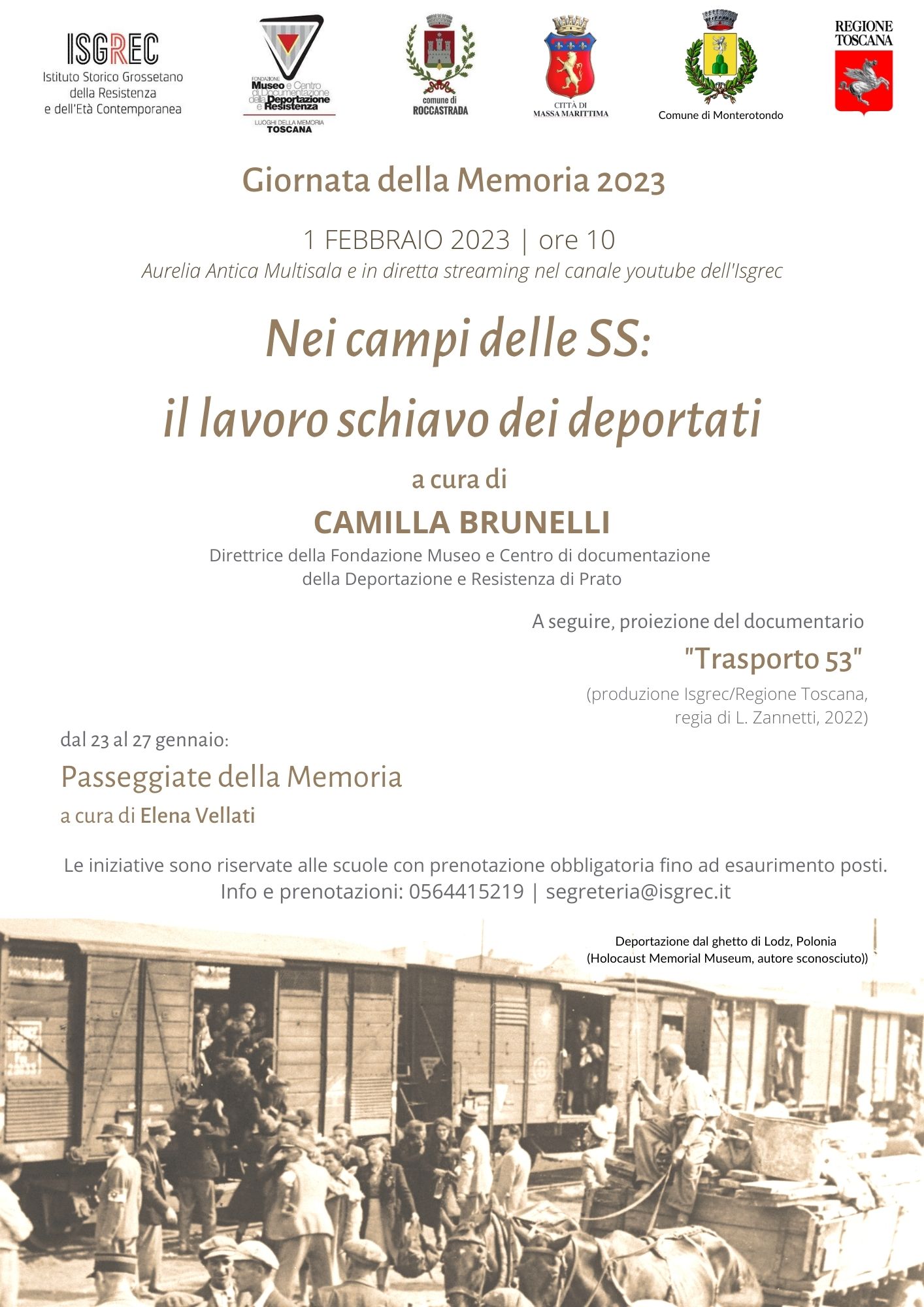 GROSSETO. Dal 23 al 27 gennaio ci saranno le consuete “Passeggiate della memoria” a cura di Elena Vellati (Isgrec). Si tratta di visite guidate per le scuole di ogni ordine e grado ai segni della memoria della deportazione politica nel contesto urbano di Grosseto. L’Isgrec è a disposizione degli insegnanti per laboratori didattici in classe sui temi della deportazione.