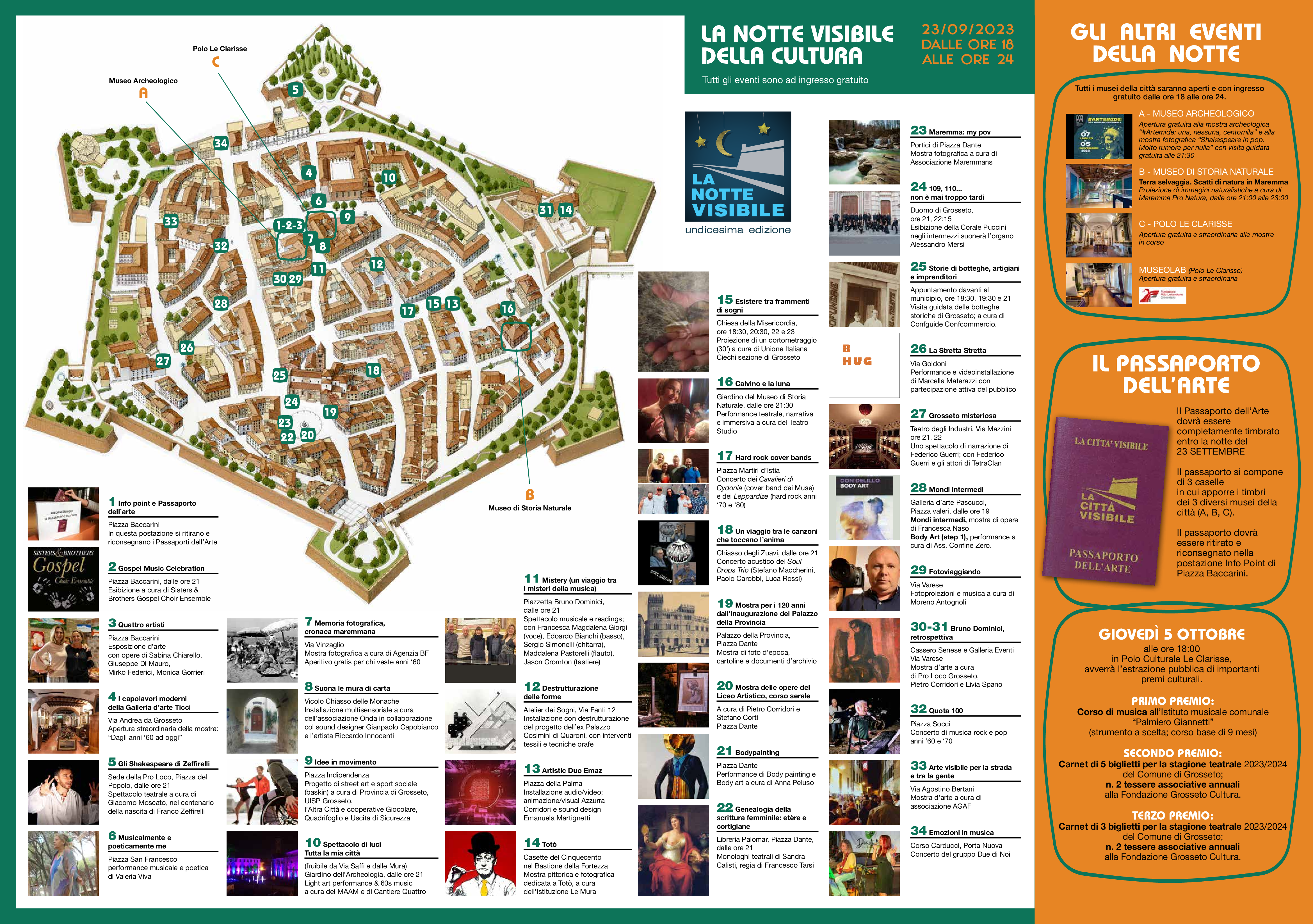 In piazza Baccarini sarà allestito l’info point dove sarà possibile ricevere informazioni sulla rassegna e ritirare il Passaporto dell’arte che dovrà essere timbrato nei tre musei cittadini visitabili gratuitamente (Polo Le Clarisse, Museo di storia naturale della Maremma, Maam-Museo archeologico e d’arte della Maremma).