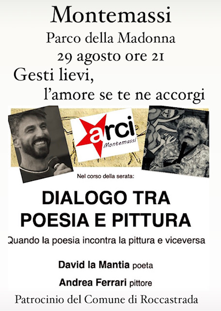 MONTEMASSI. Al parco della Madonna, il 29 agosto alle 21 si incontreranno il poeta David la Mantia, e il pittore Andrea Ferrari.