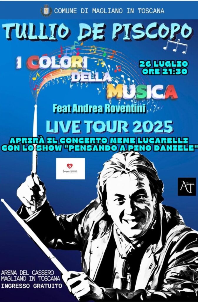 MAGLIANO IN TOSCANA. Nella suggestiva cornice dell’arena del Cassero, incastonata tra le antiche mura medievali di Magliano in Toscana, venerdì 26 luglio alle 21.30 si terrà un evento imperdibile: il concerto gratuito di Tullio De Piscopo, tappa del suo acclamato live tour “I colori della musica”.