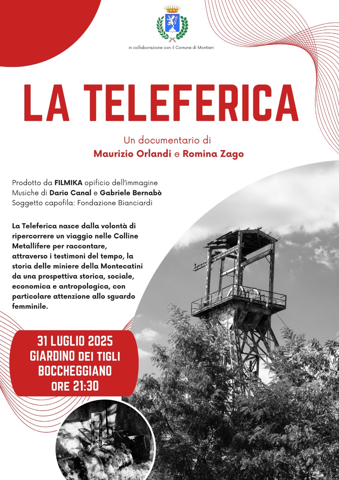Giardino dei Tigli Boccheggiano, ItalyMONTIERI. Giovedì 31 luglio alle ore 21,30 al Giardino dei Tigli sarà proiettato l'ultimo docufilm firmato da Maurizio Orlandi "La Teleferica". Un documentario di 90 minuti che racconta l'impronta indelebile della storia dell'attività estrattiva nel territorio delle Colline Metallifere. Tra filmati originali e fotografie firmate da Corrado Banchi, storico e famoso fotografo di Massa Marittima, […]