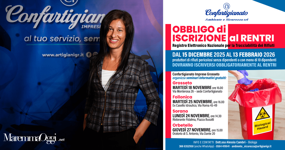GROSSETO. Confartigianato Imprese Grosseto organizza una serie di seminari informativi gratuiti dedicati all’obbligo di iscrizione al RENTRI – Registro Elettronico Nazionale per la Tracciabilità dei Rifiuti, in vigore dal 15 dicembre 2025 al 13 febbraio 2026. Durante questo periodo, i produttori di rifiuti pericolosi senza dipendenti o con meno di 10 dipendenti saranno tenuti a […] |