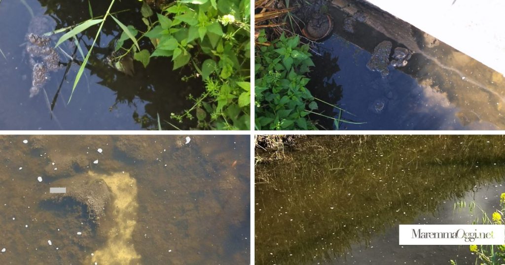 GROSSETO. Fanghi di depurazione nel fosso dei Mulini, corso d’acqua del reticolo fra la città e il mare, che sfocia nell’Ombrone a due passi dalla foce, quindi dalle spiagge di Principina.