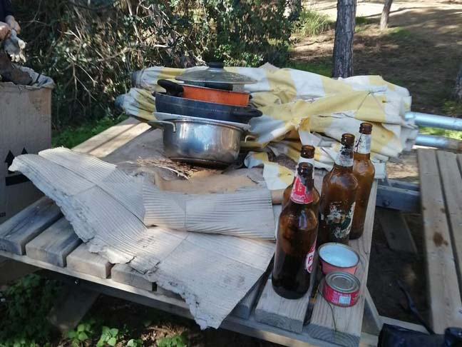 - pineta sporca e disseminata da bivacchi degli ambulanti con ancora sacchi pieni di merce, impalcature dei carretti, centinaia di bottiglie di birra e di plastica, lattine di cibo e di gas da campo vuote e addirittura pentole e padelle;
