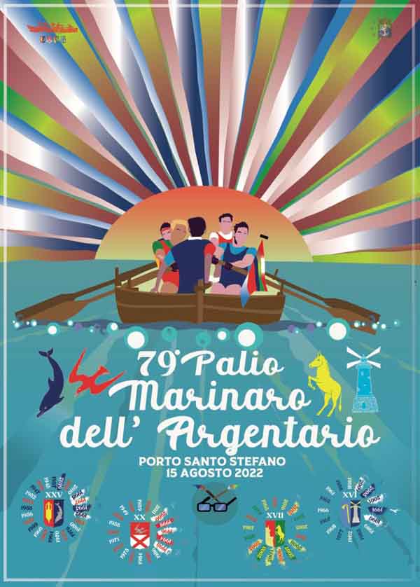 Presentato anche il nuovo manifesto del Palio dell’Argentario, realizzato dal grafico e artista Paolo Castriconi, che nel 2020 durante il blocco per la pandemia disegnò quello dedicato al «Palio che non c’é». Il nuovo manifesto raffigura i battelli con gli equipaggi che remano verso un’alba.