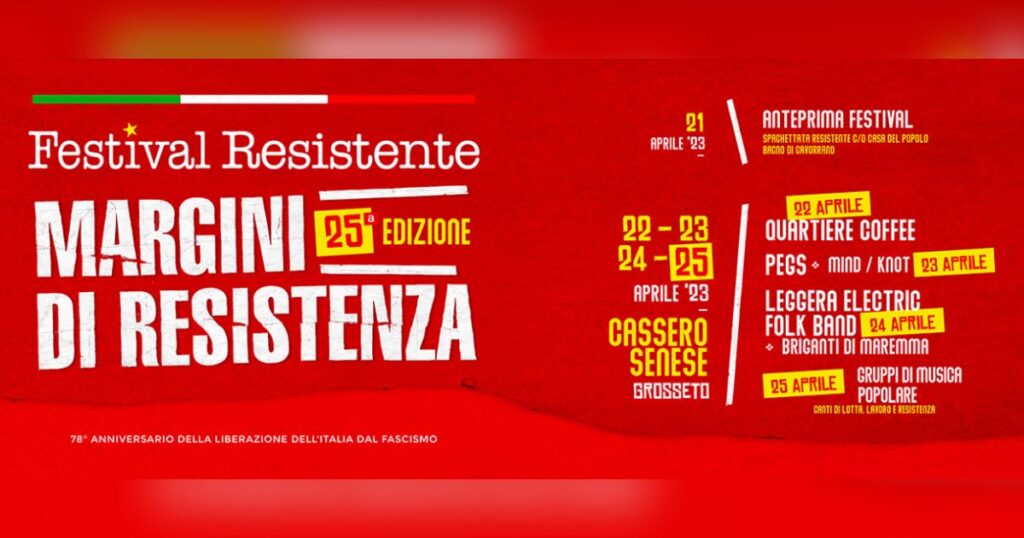 GROSSETO. Torna il “Festival resistente” al Cassero senese di Grosseto. Per la sua XXV edizione, in programma dal 22 al 25 aprile, la manifestazione che celebra la Resistenza e la Liberazione dell’Italia dal fascismo, ha scelto come titolo “Margini di resistenza”.