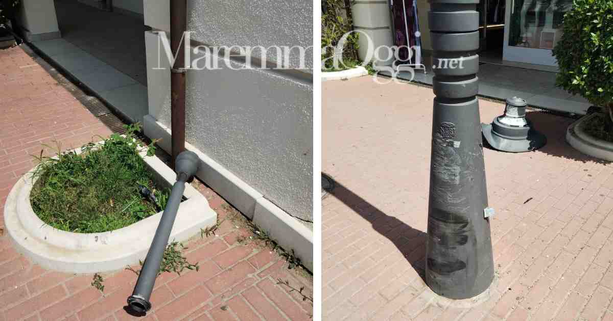 Nella sua corsa, l’auto ha danneggiato gli arredi urbani: il lampione è rotto, pezzi sono sparsi ovunque, insieme ai vetri dei fari della vettura.