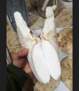 Nella speciale collezione di Otello, ci sono anche un porcino con la cappella anche sotto al gambo, una rarità assoluta e un altro con una cappella da 20 cm e gambo da 13, ancora giovane e in crescita. Otello ha trovato anche una mazza di tamburo aperta con cappella di 21 cm, enorme per la specie.