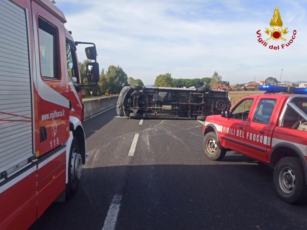 ORBETELLO. Paura sulla strada statale Aurelia, nel comune di Orbetello, domenica 19 ottobre poco prima delle 15 dove un furgone Mercedes Sprinter con rimorchio si è ribaltato sulla corsia nord, nei pressi dell’uscita per Patanella.