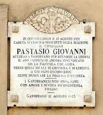 «In questo luogo il 17 agosto 1921 cadeva ucciso dai moschetti della reazione il compagno Giovanni Pastasio. – ricorda la lapide – Accorso a Gavorrano per difendere la libertà. Il suo sacrificio ancora invendicato sia la fiaccola che guida verso quell’ideale di giustizia e di libertà, a cui ogni oscuro eroe seppe immolare la propria esistenza. I gavorranesi non immemori con amore e devota riconoscenza posero. Gavorrano 17 agosto 1945»