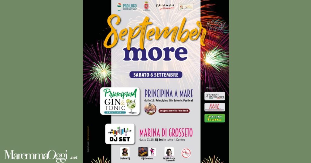 GROSSETO. Sabato 6 settembre la Pro Loco di Marina e Principina inaugura il mese con “September more”, il primo grande appuntamento settembrino della riviera della Maremma. Un evento che unisce gin artigianale, gastronomia locale, musica e spettacolo in due location: Principina a mare e Marina di Grosseto.