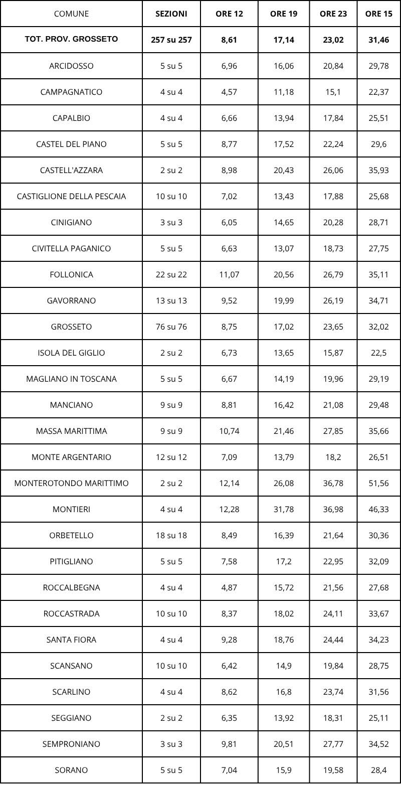 La città di Grosseto ha superato di poco la media nazionale, portando alle urne il 32 percento di votanti. Follonica invece, la seconda città della Provincia per popolazione residente, ha registrato il 35 percento di cittadini andati alle urne. Con il 30 per cento di votanti, Orbetello rispecchia in pieno la media nazionale.