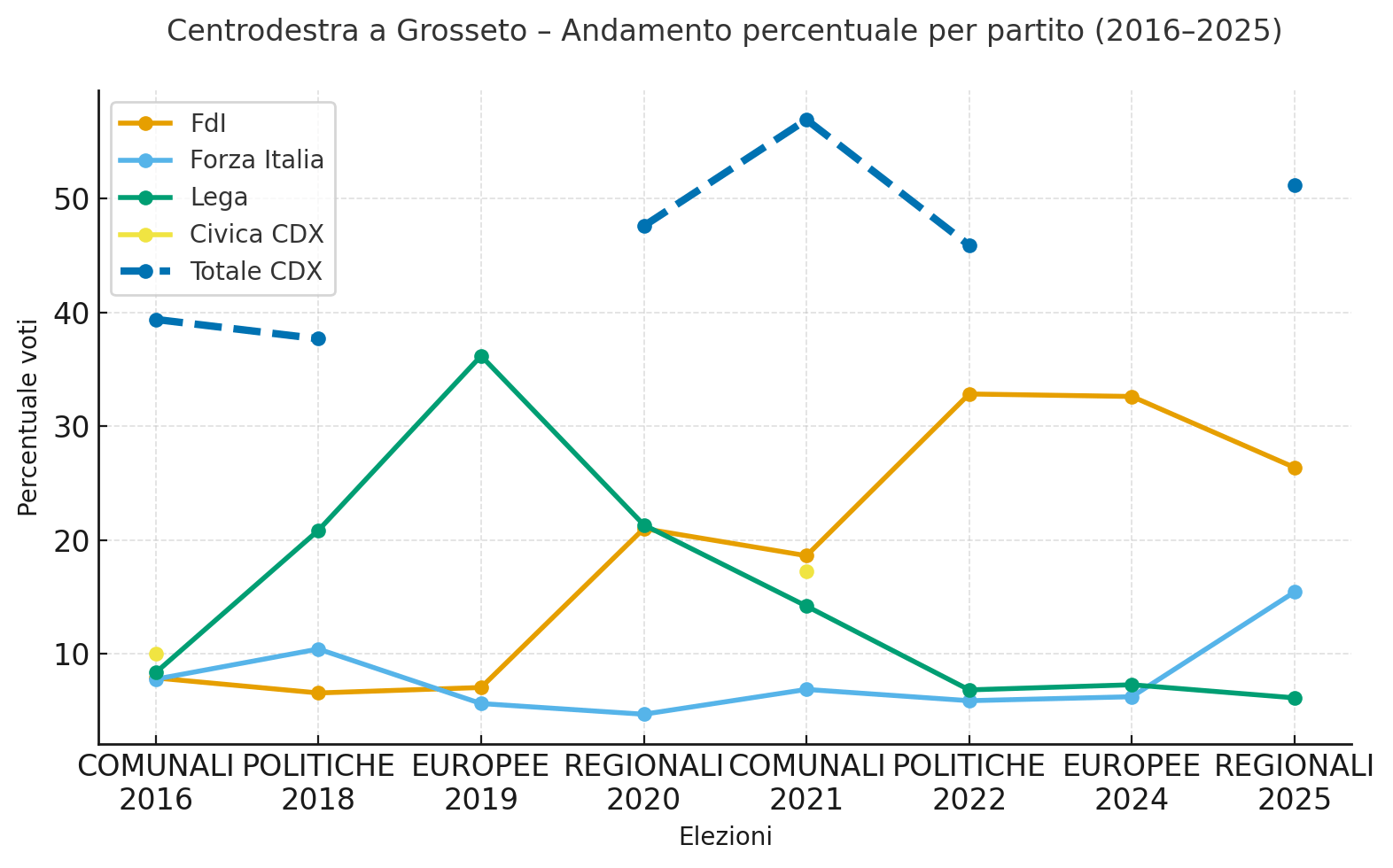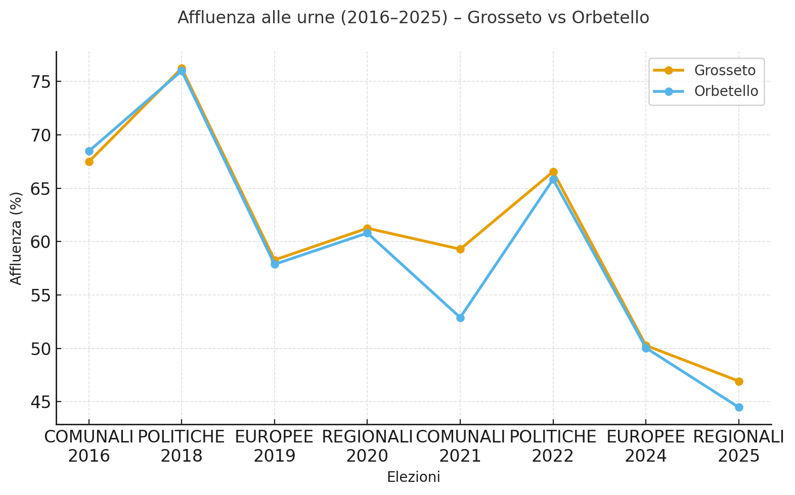 L’analisi degli ultimi dieci anni elettorali a Grosseto e Orbetello restituisce un quadro chiaro: la Maremma non è più blindata dal centrodestra, ma nemmeno già conquistata dal centrosinistra. Le distanze si sono ridotte, i blocchi si sono riequilibrati e le prossime comunali del 2027 si preannunciano più aperte che mai.