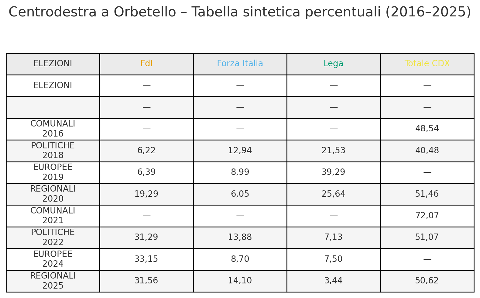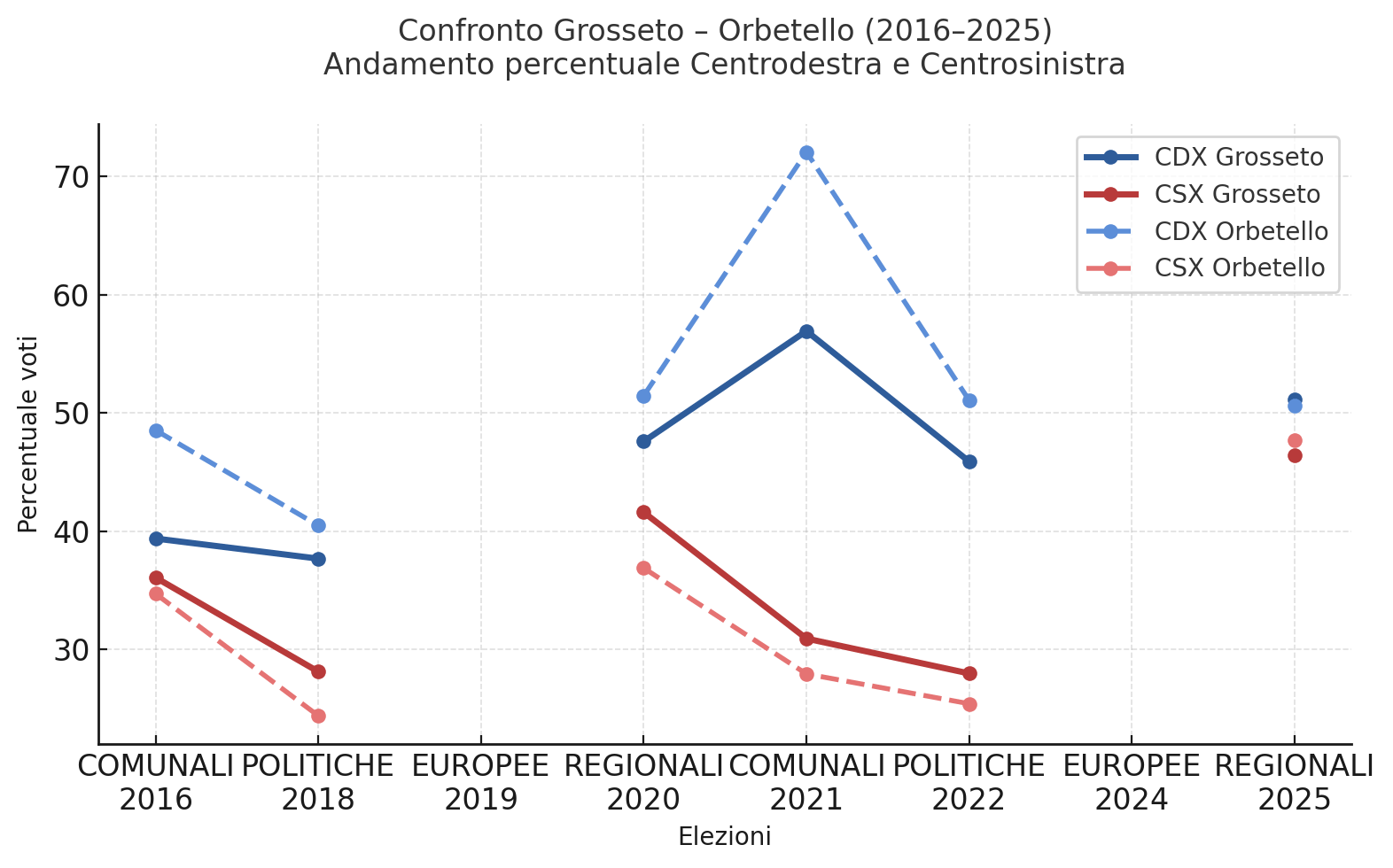 A Orbetello, dove la coalizione guidata da FdI aveva toccato il 72% alle comunali 2021, il centrosinistra è risalito fino al 47,7% alle regionali 2025: un recupero di oltre 40 punti percentuali in quattro anni.
