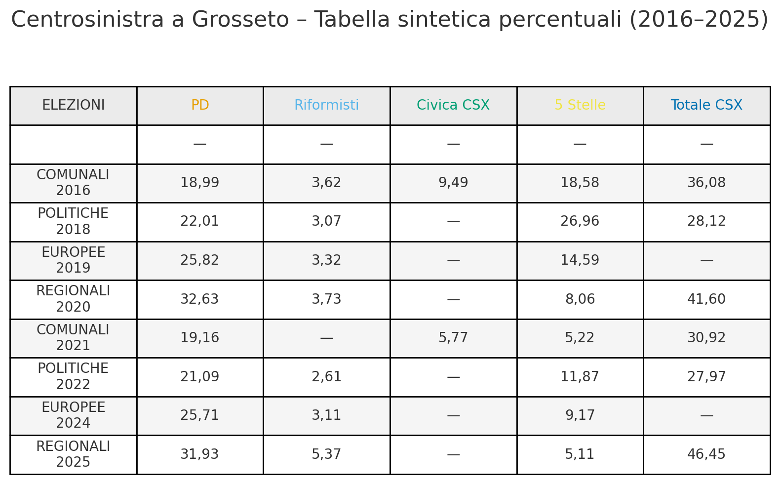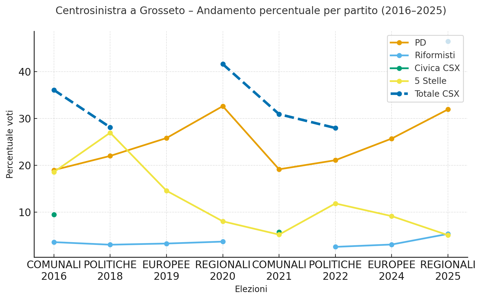 Il Pd, pur non raggiungendo i livelli di Grosseto, passa dal 19,5% del 2018 al 25,9% del 2025, diventando il perno di un’alleanza che alle ultime regionali ha sfiorato la vittoria.