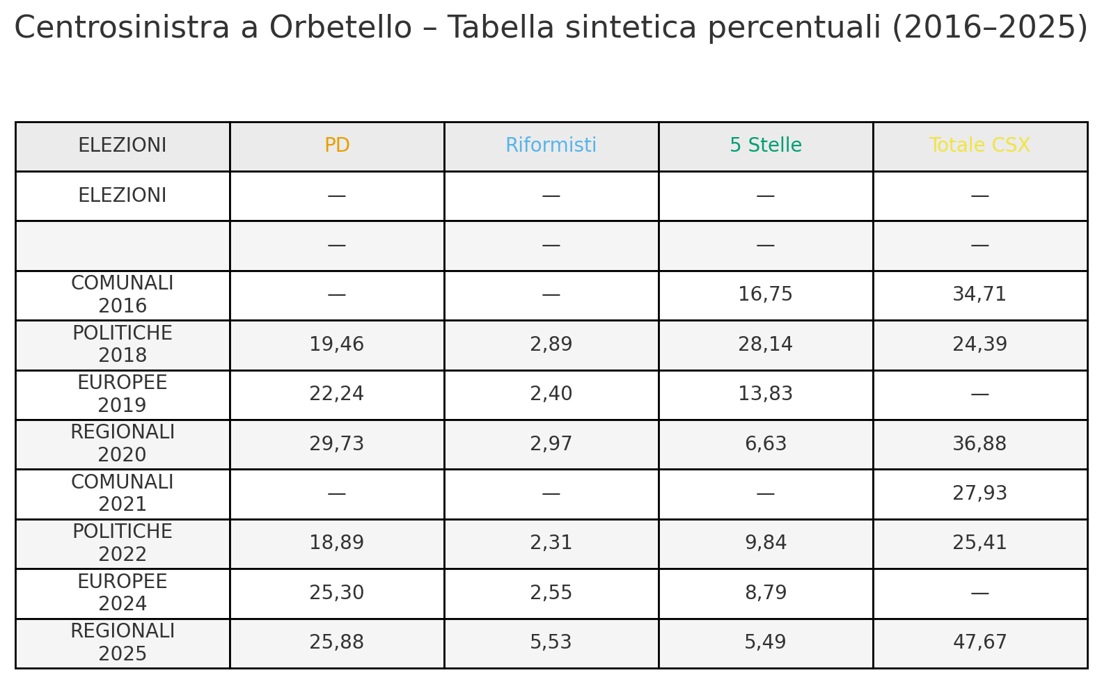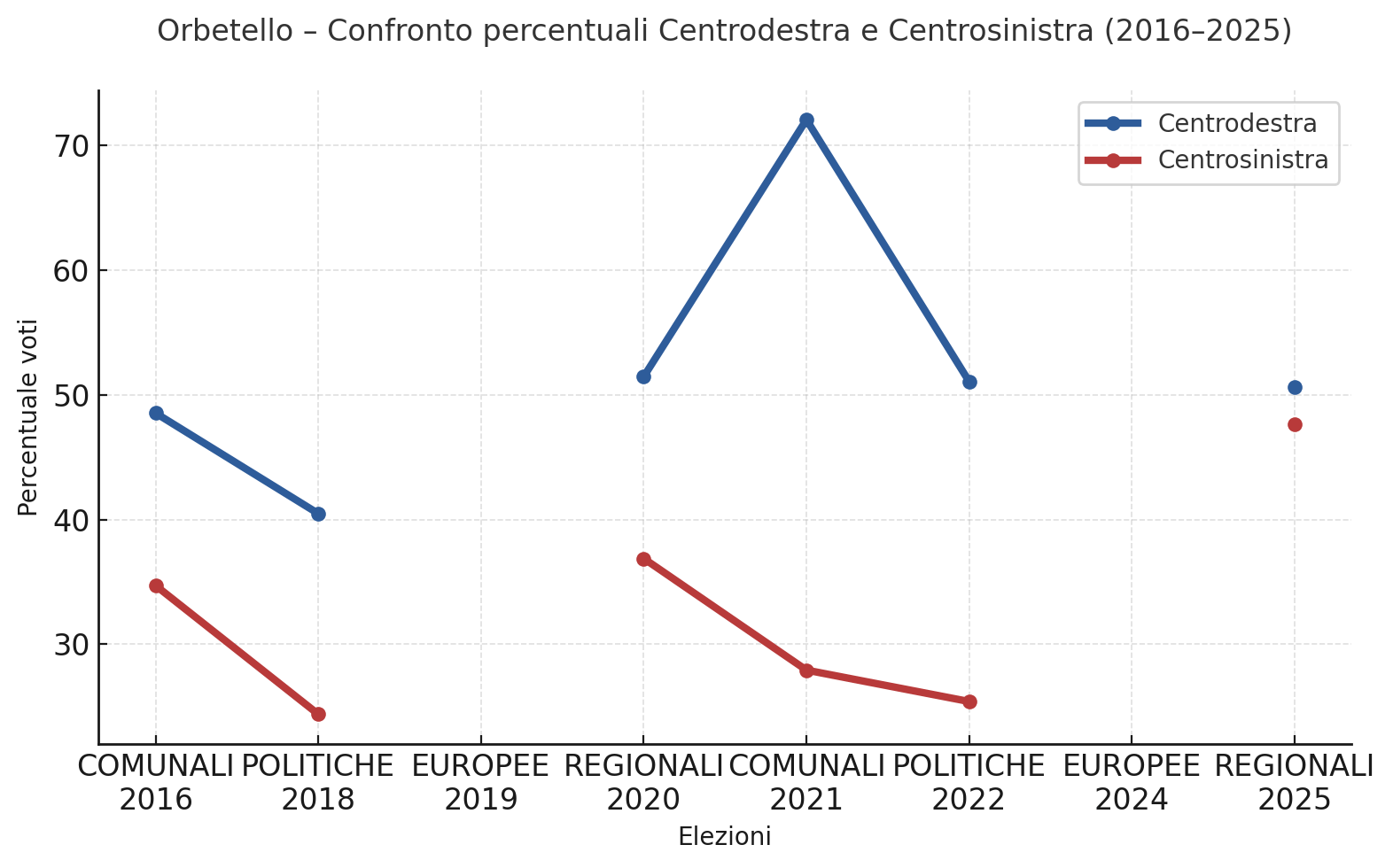 Il totale di coalizione cresce fino al 47,7%, riportando Orbetello tra i comuni contendibili. Un risultato costruito nel tempo, grazie anche alla crescita dell’area progressista e ambientalista, che alle regionali 2025 ha aggiunto un ulteriore 1,7%.